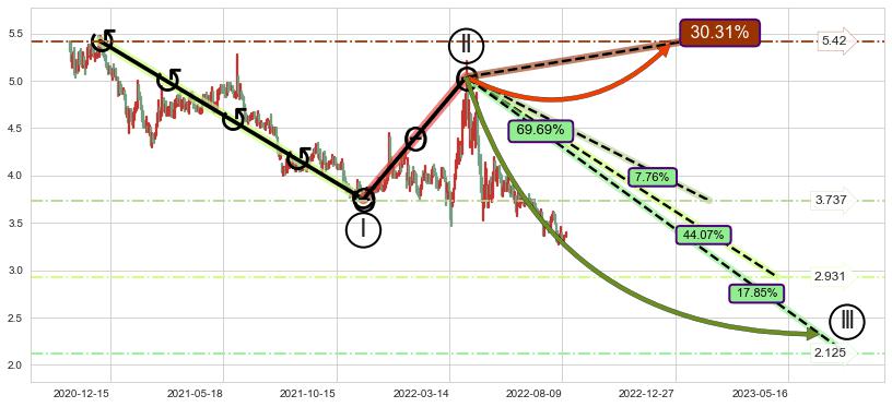 2022-04-27: 第一阻力位3.581有效抑制了下跌浪,成功阻止了价格的继续下跌。