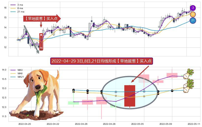 形态多维评估: ⚀ 2022-04-29日显现 3日-8日-21日均线 【旱地拔葱】买入点 看多信号,后市看涨,买入
