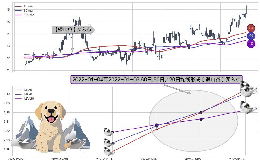 形态多维评估: ⚀ 2022-01-05-日至2022-01-06-日显现 60日-90日-120日均线 【银山谷】买入点 看多信号,后市看涨,买入