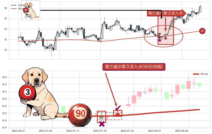 形态多维评估: ⚀ 2022-07-20-日显现 葛兰威尔均线 90日均线 第③买入点 上升趋势的中继信号,后市看涨,买进信号