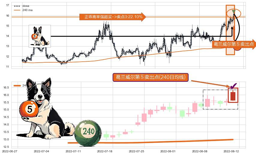 形态多维评估: ⚀ 2022-08-12-日显现 葛兰威尔均线 240日均线 第⑤卖出点 上升趋势均值回复的短线回落信号,后市看跌,卖出信号