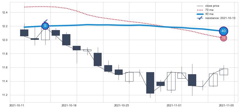 下跌趋势2021-10-11-2021-11-05,均线40确认关键阻力1处