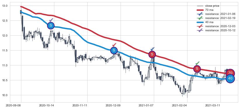 下跌趋势2020-09-08-2021-03-17,均线40, 70确认关键阻力4处