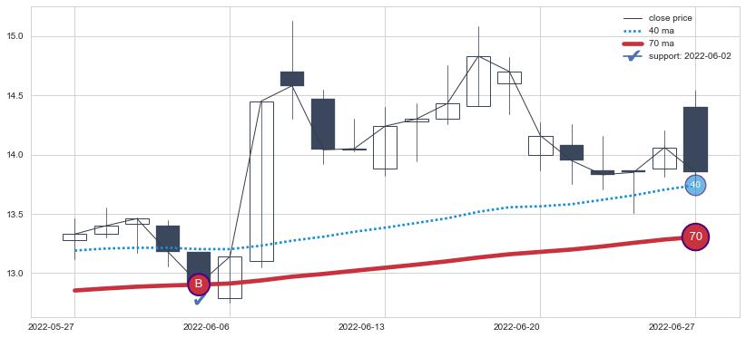 上涨趋势2022-05-27-2022-06-27,均线70确认关键支撑1处