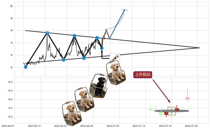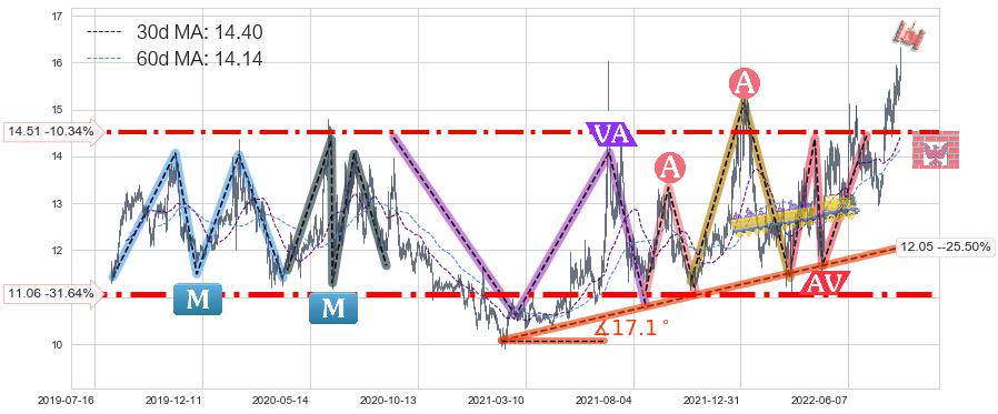 ➣ 【多空双方观望→争持→促使价格波动日益狭窄→多方打破攻守平衡点】对称三角形中继整理, 已在2022-07-25突破【阻力】颈线 14.73 →演变成上升通道