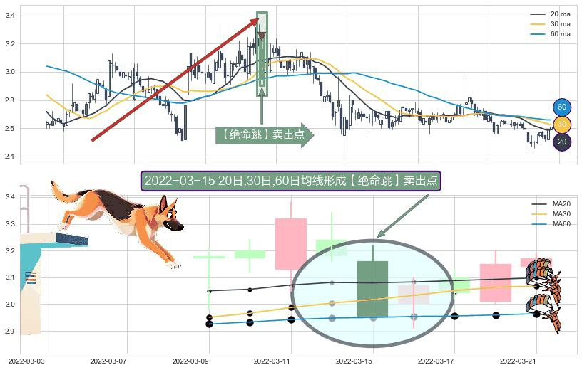 形态多维评估: ⚀ 2022-03-15日显现 20日-30日-60日均线 【绝命跳】卖出点 看空信号,后市看跌,卖出