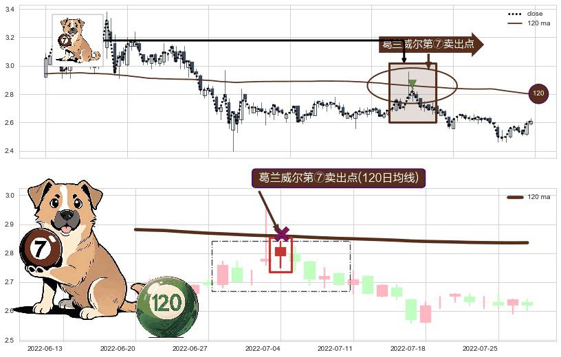 形态多维评估: ⚀ 2022-07-04-日显现 葛兰威尔均线 120日均线 第⑦卖出点 下降趋势的中继信号,后市看跌,卖出信号