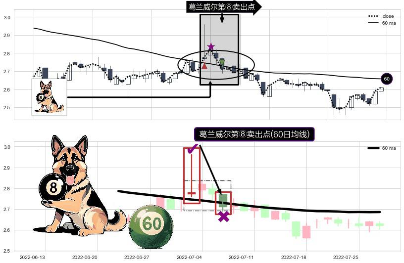形态多维评估: ⚀ 2022-07-06-日显现 葛兰威尔均线 60日均线 第⑧卖出点 下降趋势的中继信号,后市看跌,卖出信号