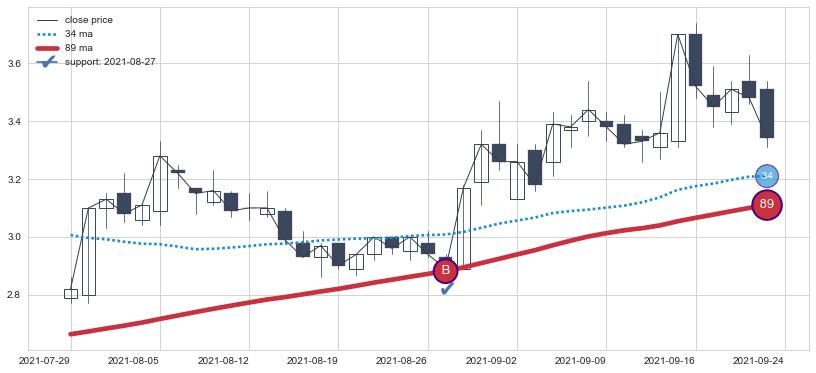 上涨趋势2021-07-29-2021-09-24,均线89确认关键支撑1处
