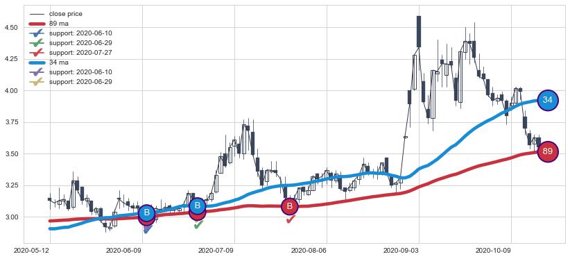 上涨趋势2020-05-12-2020-10-19,均线89, 34确认关键支撑3处