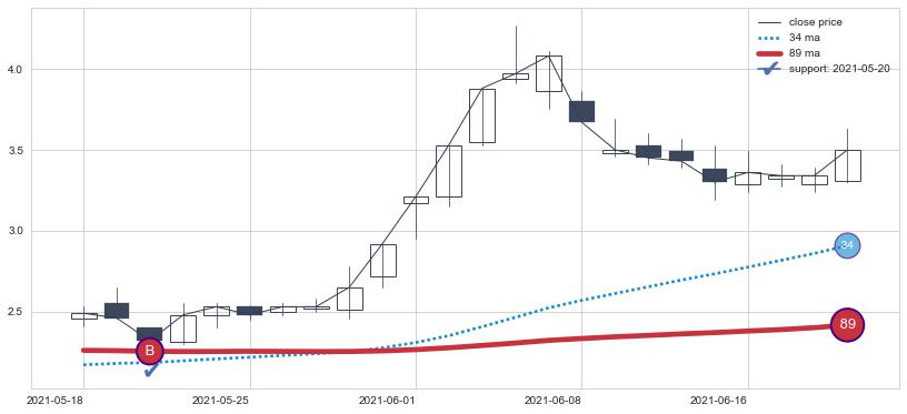 上涨趋势2021-05-18-2021-06-21,均线89确认关键支撑1处