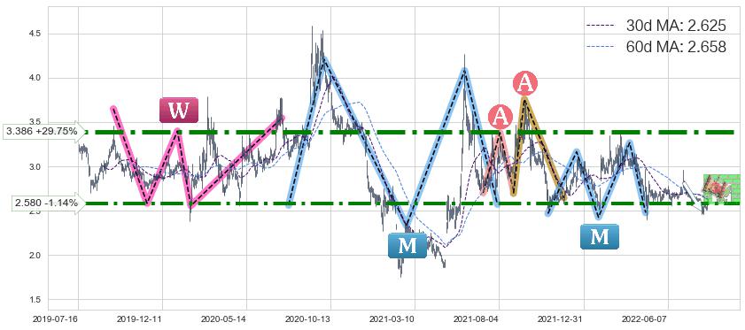 ♘ 阻力价格位2.580,可信任强度83.56%,距离最后交易2022-08-12形成的收盘价格2.610相差 -1.14%