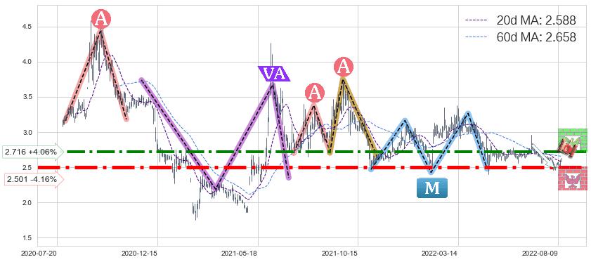 ♘ 阻力价格位2.716,可信任强度77.53%,距离最后交易2022-08-12形成的收盘价格2.610相差 +4.06%