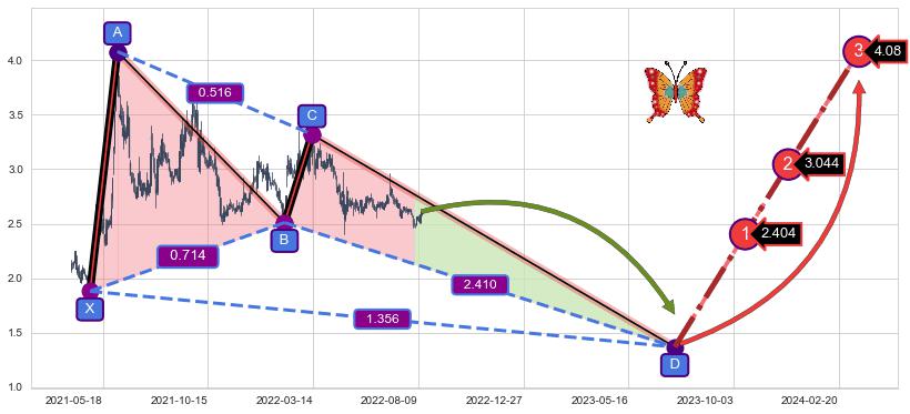 ➣ 未完成【蝴蝶】形态起点X: 2021-04-27, 已到达C点: 2022-03-11, 预测最终D点: 2023-07-17, 共550交易日