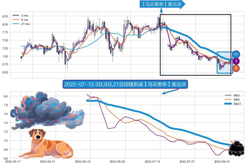 ⚀ 2022-06-14日-2022-08-11日显现 3日-8日-21日均线 【乌云密布】卖出点 看空信号,后市看跌,卖出