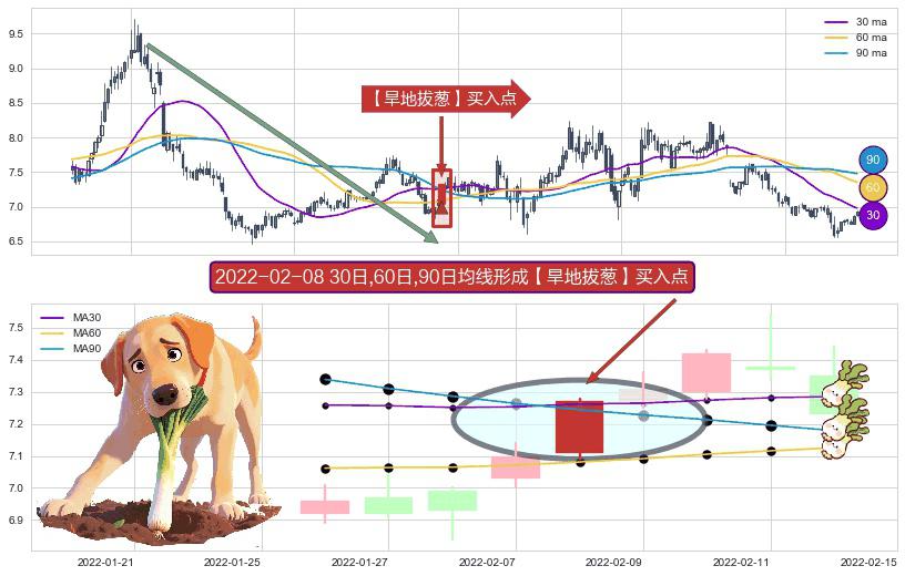 ⚀ 2022-02-08日显现 30日-60日-90日均线 【旱地拔葱】买入点 看多信号,后市看涨,买入