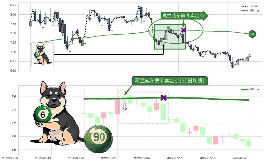 ⚀ 2022-06-28-日显现 葛兰威尔均线 90日均线 第⑥卖出点 走势反转见顶信号,后市看跌,卖出信号