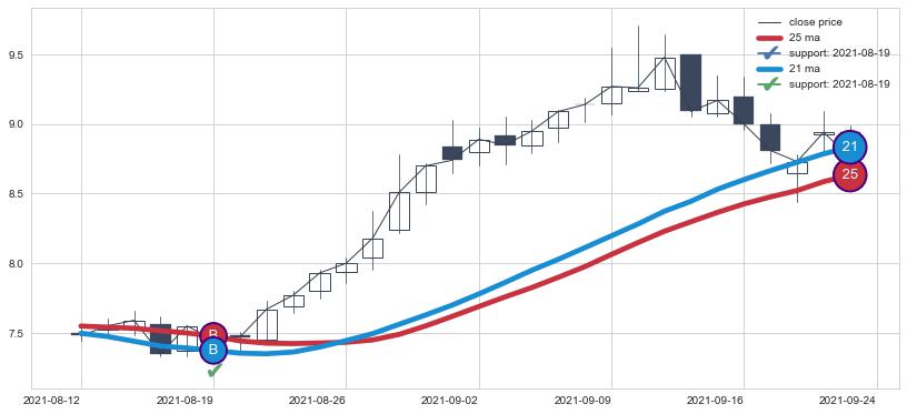 ⚁ MA3和MA8走势平行,且始终保持在短距离内,MA21始终在短中期均线上方,与短中期均线保持一定的距离,微微下行