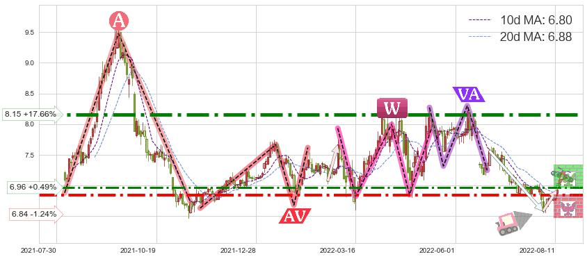 ♘ 支撑价格位6.84,可信任强度73.11%,距离最后交易2022-08-12形成的收盘价格6.93相差 -1.24%