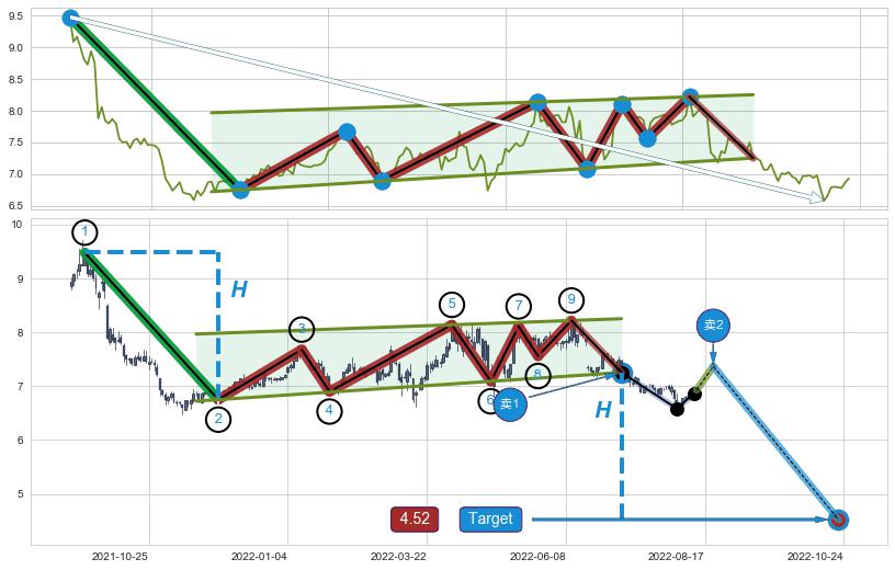 ➢ 阻力位【③⑤⑦⑨】波动逐渐走高,构成【旗形】下平行线