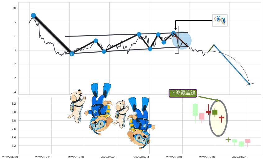 | 2 🅚:【死亡谷】卖出点 ➕ 📐:下降对称三角整理下行突破支撑位破位, 猜想持续下沉下跌,被突破的支撑位已变为阻力位 ☞ 看空信号 ⇥ 【均线】交织【图形】⇥ 综合量化分数: 34 | > |