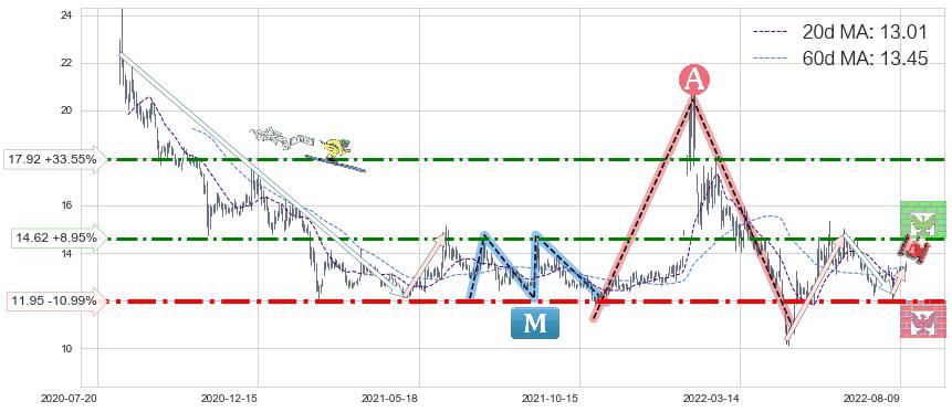 ♘ 阻力价格位14.62,可信任强度62.11%,距离最后交易2022-08-12形成的收盘价格13.42相差 +8.95%