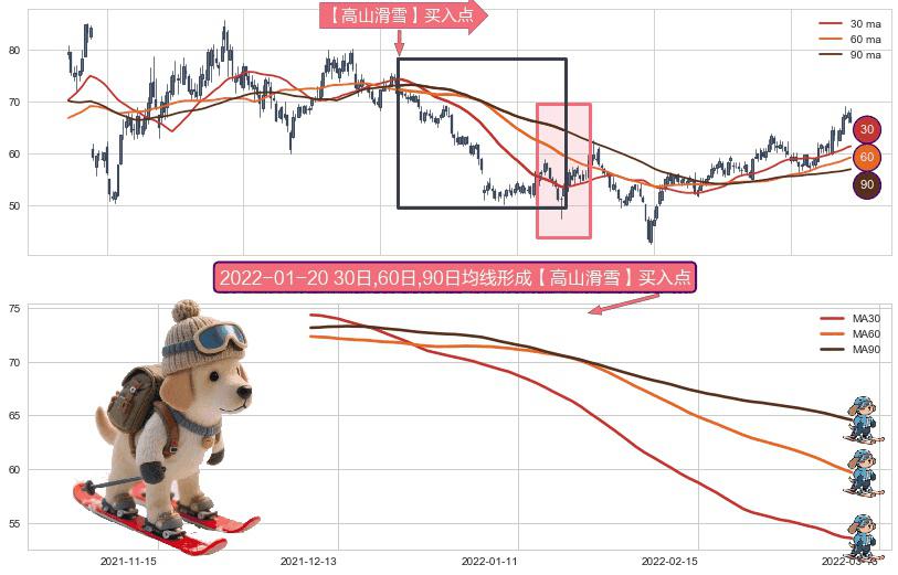 ⚀ 2021-12-08日-2022-03-10日显现 30日-60日-90日均线 【高山滑雪】买入点 看多信号,后市看涨,买入