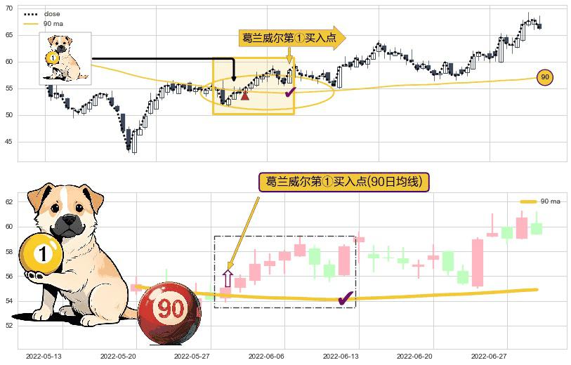 ⚀ 2022-05-30-日显现 葛兰威尔均线 90日均线 第买①入点 走势反转见底信号,后市看涨,买进信号