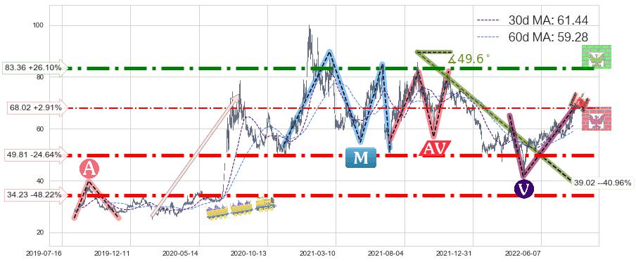 ♘ 支撑价格位49.81,可信任强度93.80%,距离最后交易2022-08-12形成的收盘价格66.10相差 -24.64%