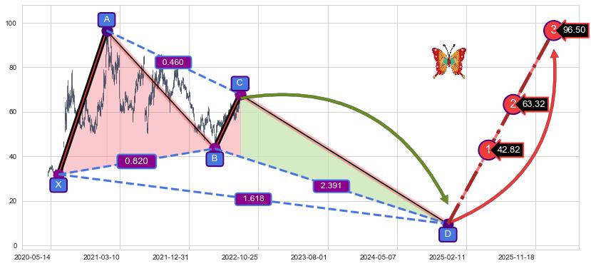 ➣ 未完成【蝴蝶】形态起点X: 2020-06-15, 已到达C点: 2022-08-11, 预测最终D点: 2024-11-29, 共1127交易日