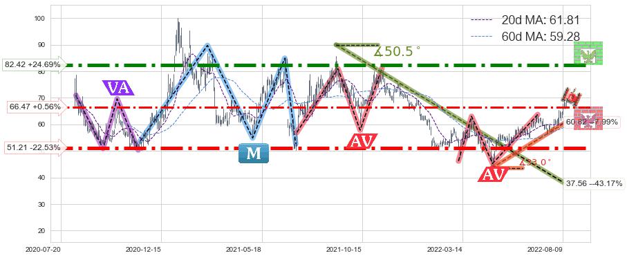 ♘ 支撑价格位66.47,可信任强度65.07%,距离最后交易2022-08-12形成的收盘价格66.10相差 +0.56%
