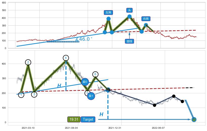 ➣ 最小反转跌幅→𝐇: 202.79 (头部与颈线垂直距离)