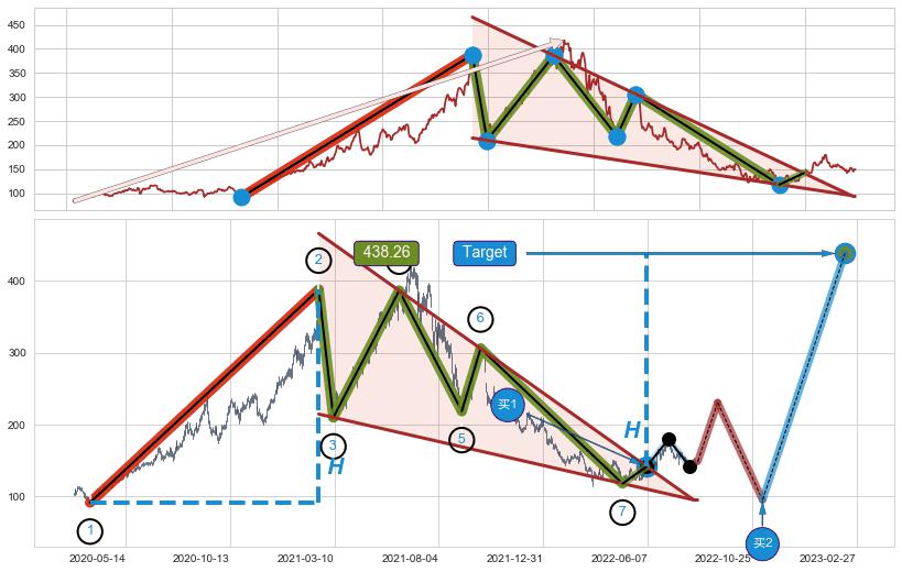 ➣ AI预测: 假定反转启动后, 第❶目标位置(2023-07-21, 210.02)