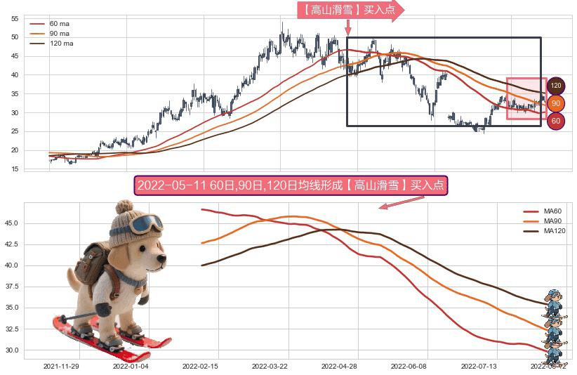 ⚀ 2022-02-07日-2022-08-08日显现 60日-90日-120日均线 【高山滑雪】买入点 看多信号,后市看涨,买入