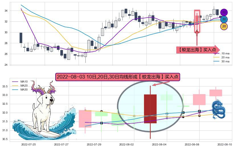 ⚀ 2022-08-03日显现 10日-20日-30日均线 【蛟龙出海】买入点 看多信号,后市看涨,买入