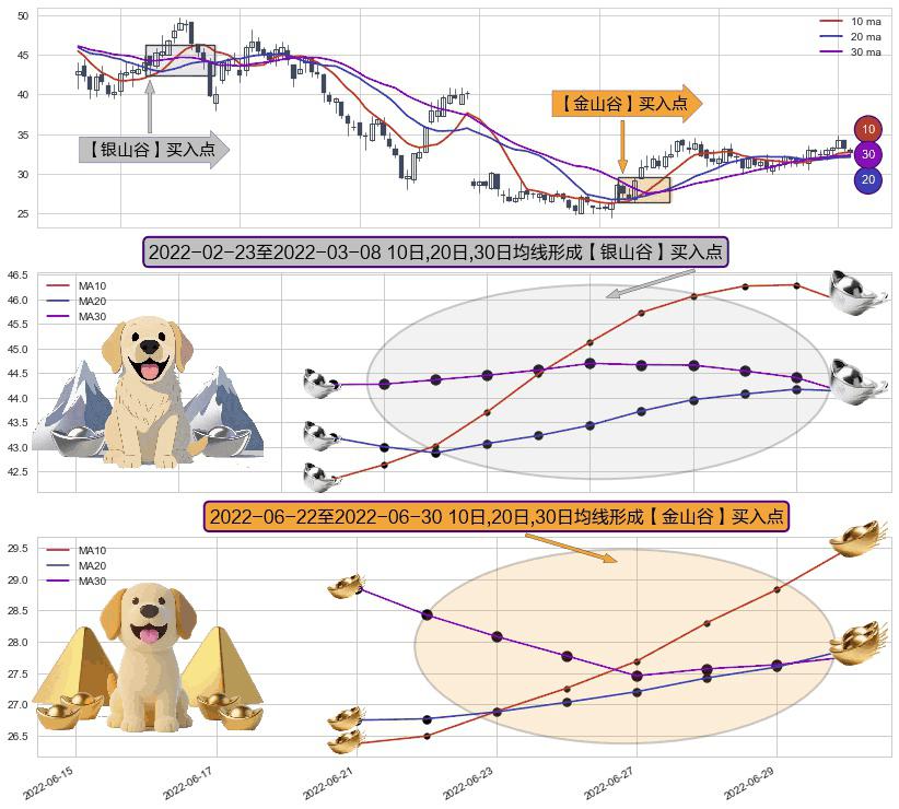 ⚂ 2022-06-23-日至2022-06-30-日显现 10日-20日-30日均线 【金山谷】买入点 其再次确认了买入信号,可靠性更强,买入