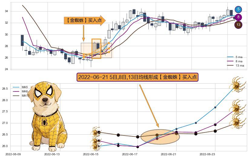 ⚀ 2022-06-21日显现 5日-8日-13日均线 【金蜘蛛】买入点 看多信号,后市看涨,买入