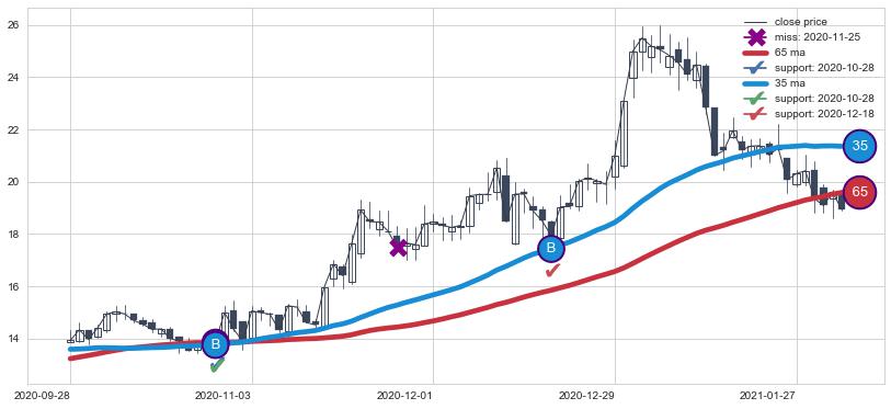 ⚅ 买点向上突破均线后,价格走势很纠结,不断在均线周围试探,有再次下探破位均线的可能