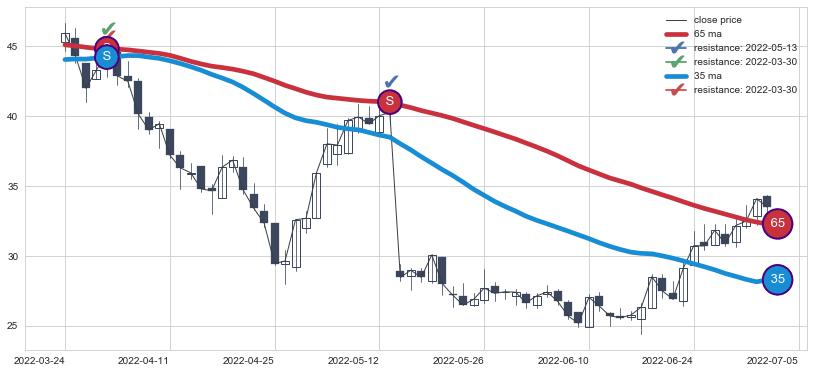 ⚄ 价格在均线遇到阻力后再次向下回落了【较短】距离, 第⑦卖出点 阻力效果【仍需验证】