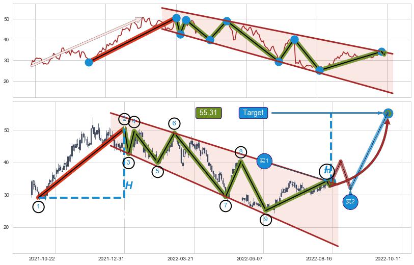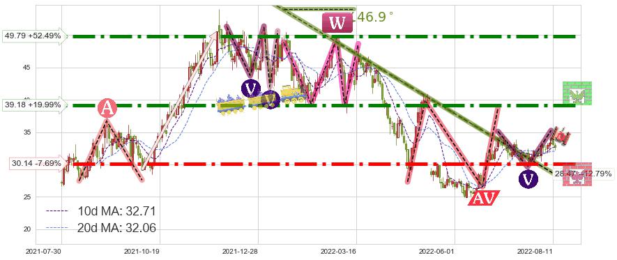 ➢ 【仅预测突破】最后价格:32.65与预测突破价格:33.98→【空间临近】后续最小【整理】第一目标价格→(2022-10-11: 55.31 )