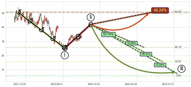 ➣ 大趋势循环浪继续向下概率53.76%