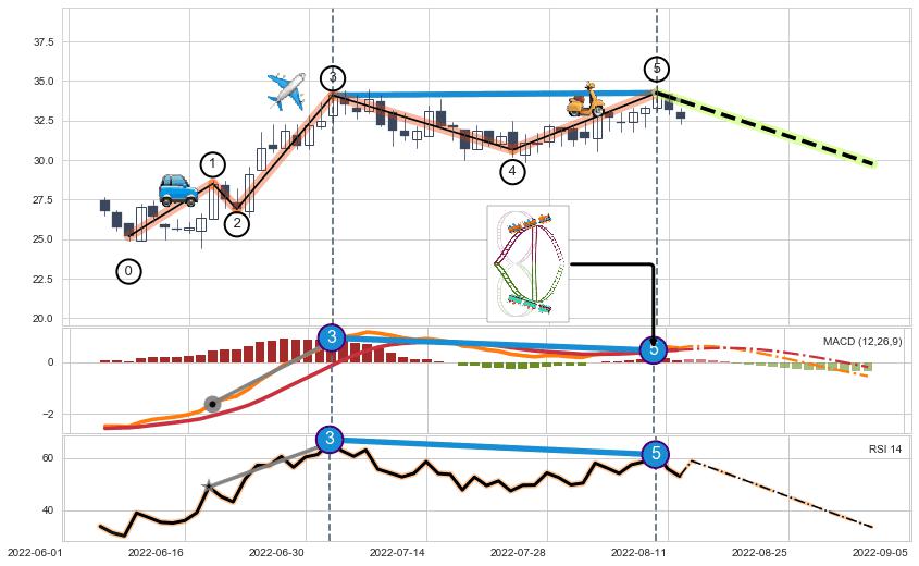 ➣ 1,3,5驱动浪MACD, RSI, KDJ走势都出现【常规背离】反转信号增强