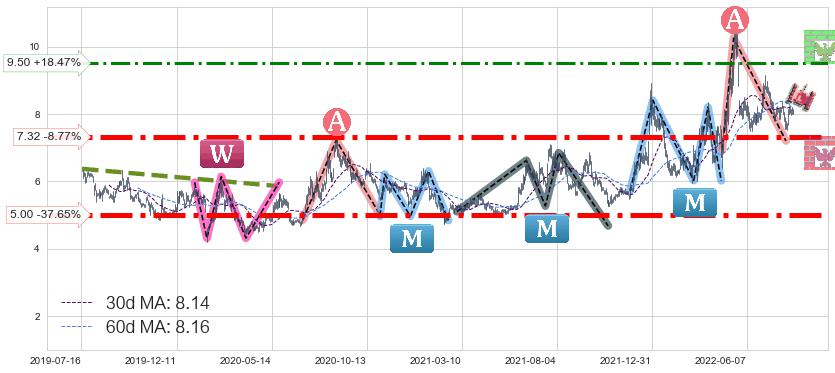 ♘ 支撑价格位7.32,可信任强度89.03%,距离最后交易2022-08-12形成的收盘价格8.02相差 -8.77%