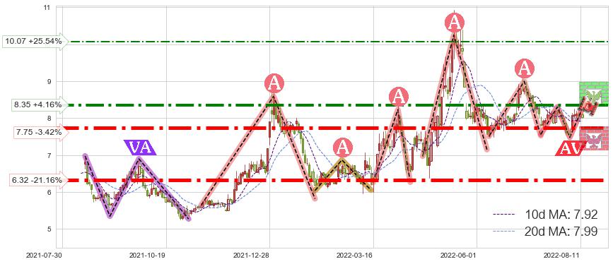 ♘ 阻力价格位8.35,可信任强度79.08%,距离最后交易2022-08-12形成的收盘价格8.02相差 +4.16%