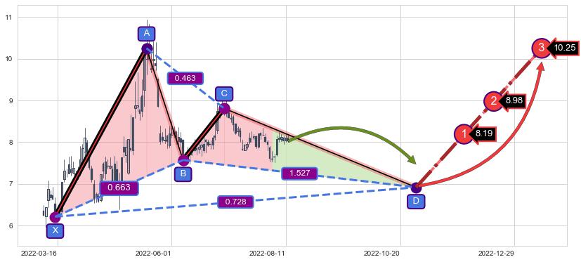 ➣ 未完成【伽利】形态起点X: 2022-03-15, 已到达C点: 2022-07-05, 预测最终D点: 2022-10-31, 共152交易日