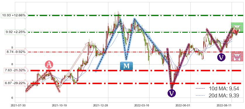 ♘ 阻力价格位10.93,可信任强度74.41%,距离最后交易2022-08-12形成的收盘价格9.70相差 +12.66%