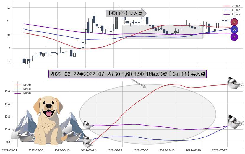 形态多维评估: ⚀ 2022-06-23-日至2022-07-28-日显现 30日-60日-90日均线 【银山谷】买入点 看多信号,后市看涨,买入