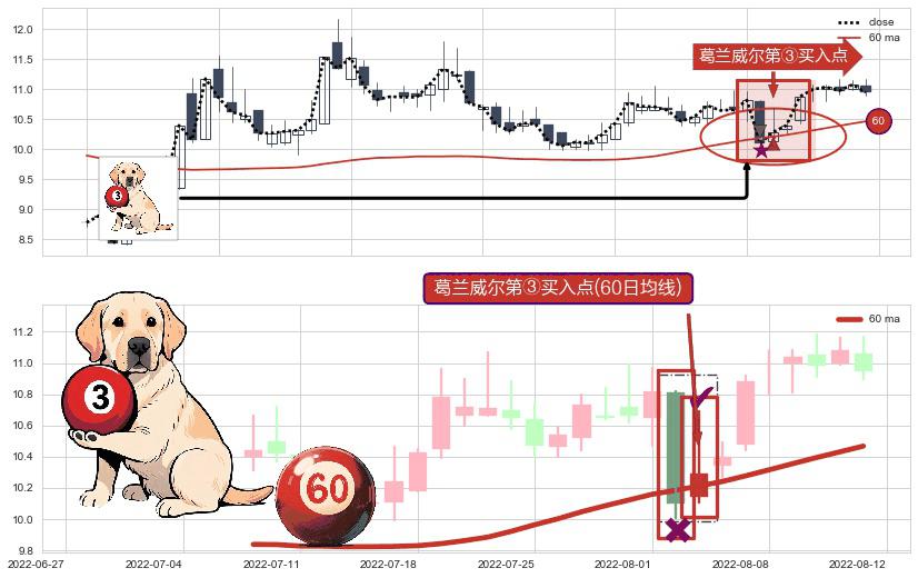 形态多维评估: ⚀ 2022-08-03-日显现 葛兰威尔均线 60日均线 第③买入点 上升趋势的中继信号,后市看涨,买进信号