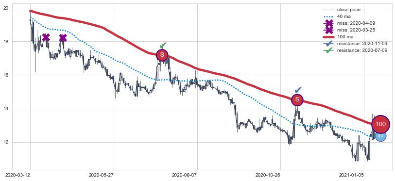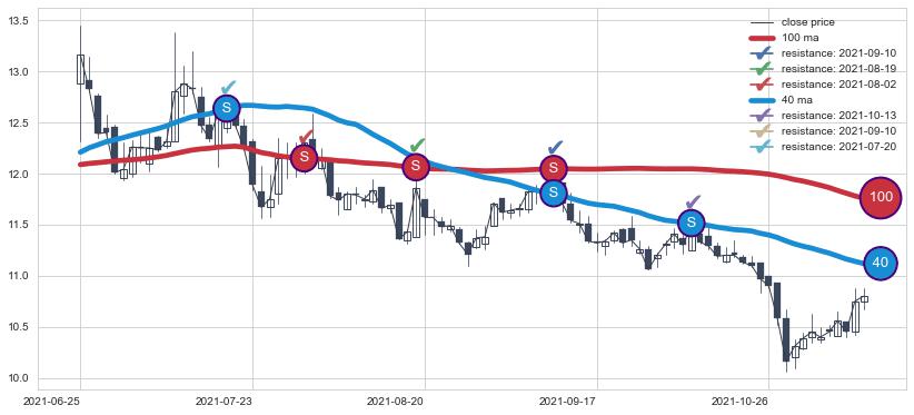 下跌趋势2021-06-25-2021-11-10,均线40, 100确认关键阻力5处