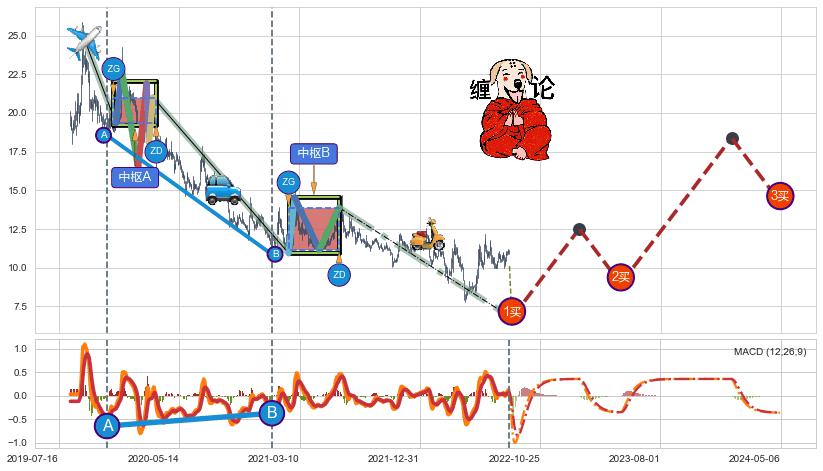 | 14 🅚:【高山滑雪】买入点 ➕ ☯️:缠论中枢点下降缠中枢AB形成后猜想拐点1买即将出现,随后猜想后续持续拉升(均值回复) ☞ 看多信号 ⇥ 【均线】交织【图形】⇥ 综合量化分数: 52 | > |